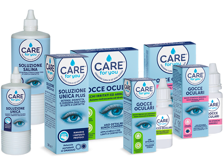 Per il trattamento e l’igiene degli occhi, Care For You® ti offre una linea studiata con ingredienti vegetali*, utile non solo per rinfrescare e idratare, ma anche in caso di arrossamento, affaticamento o irritazione. Le soluzioni per lenti a contatto Care For You® sono indicate per detergere, disinfettare, conservare, risciacquare e lubrificare le lenti a contatto.